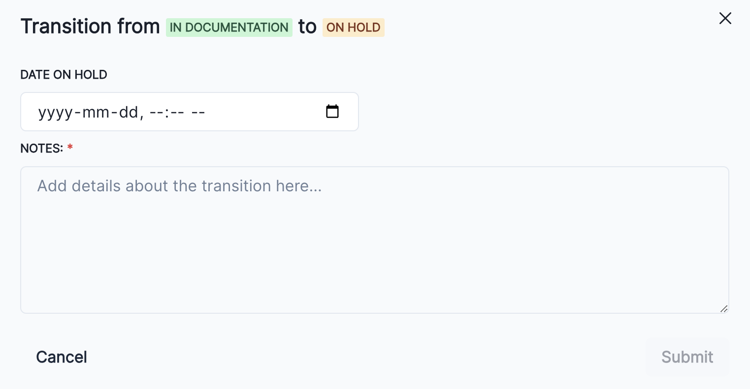 A screenshot showing the action transition panel with the Date On Hold inventory field