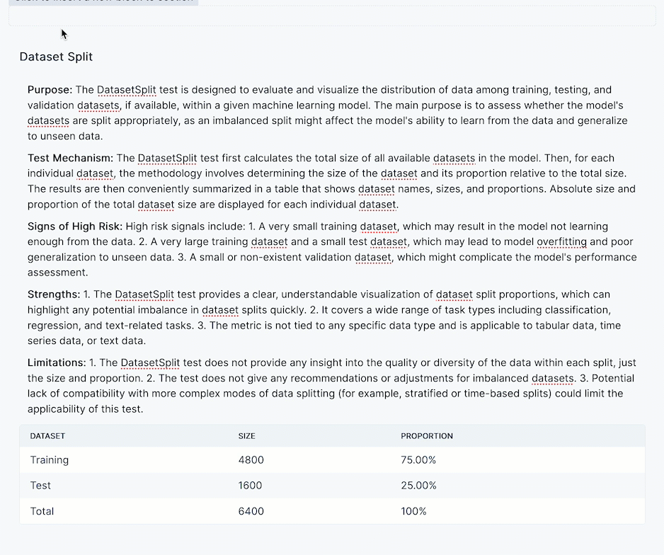 - Can be added anywhere on model documentation, validation reports, or ongoing monitoring plans and edited to include additional documentation in text format.