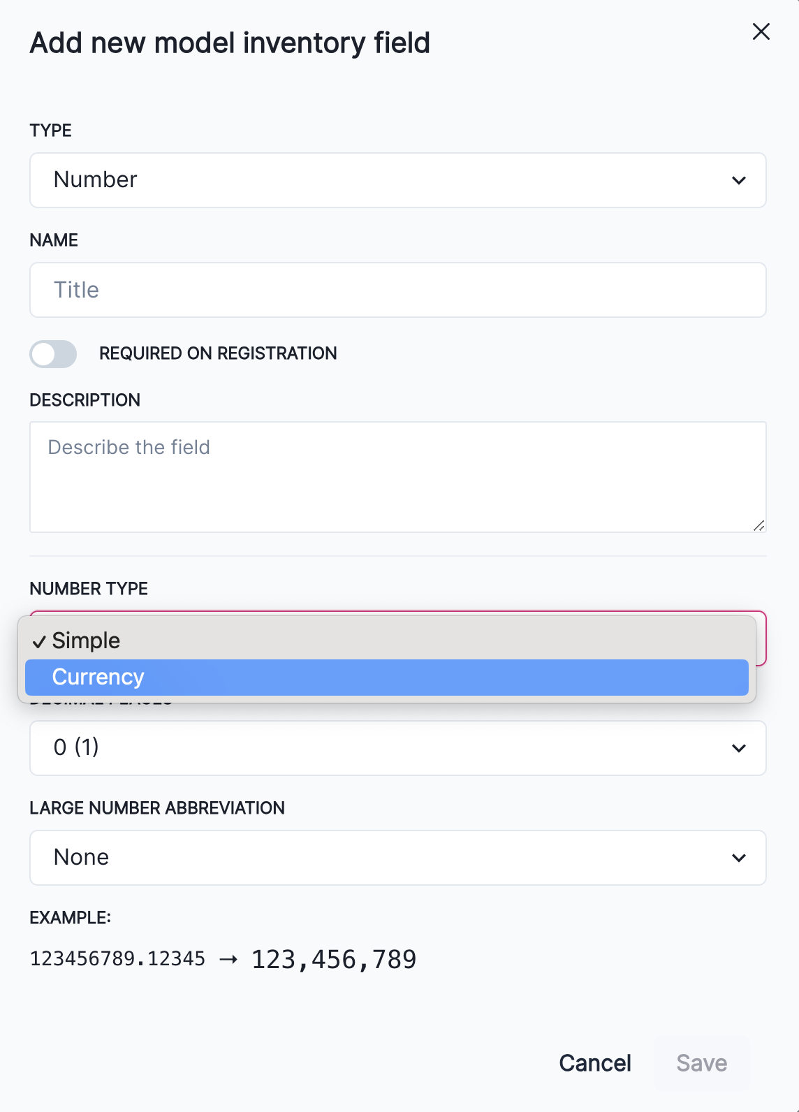 Manage Attachment permission for roles, ensuring that only authorized users can handle attachment-related tasks.We added a new Currency type for Number fields which provides formatting for currencies and large number abbreviations. This field allows you to record pricing data within a model, for example.