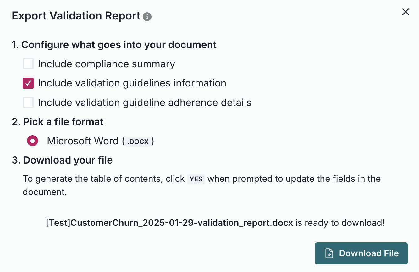 We now support additional configuration when exporting validation reports, allowing you to choose what gets included in your generated document.