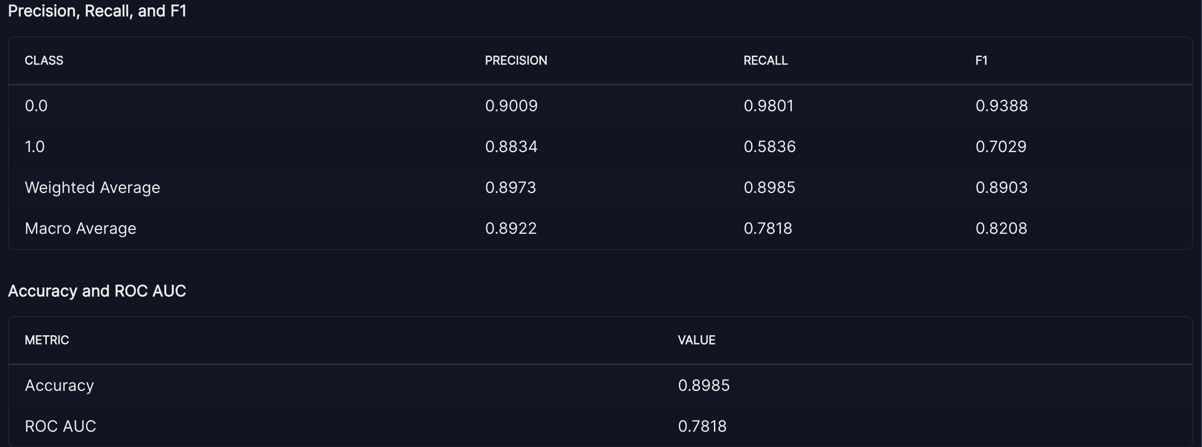 parent_section: model_developmentIn the above example, the validmind.model_validation.sklearn.ClassifierPerformance produces two tables like this: